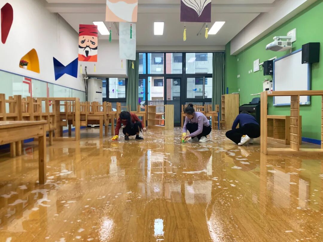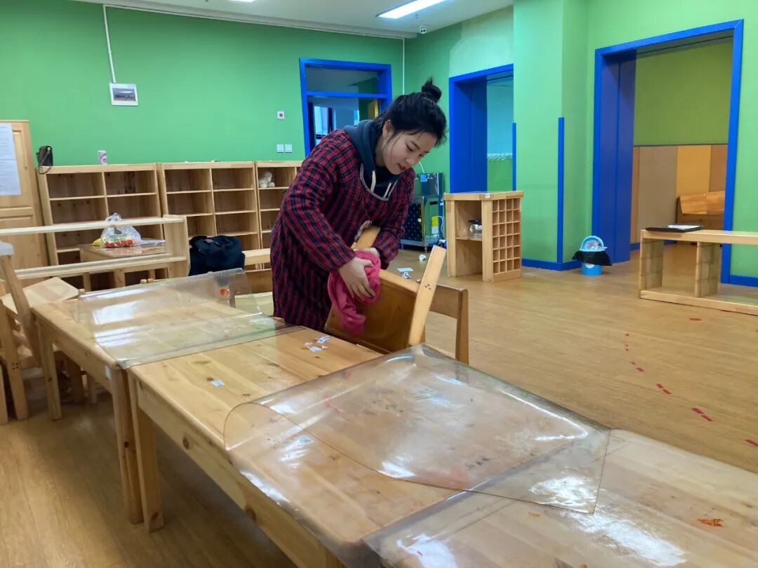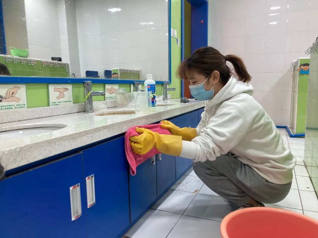 全园教职工按照卫生消毒要求齐心协力,分工合作